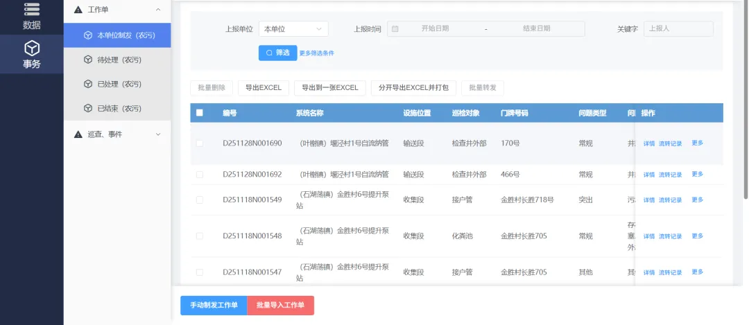 松江区通过易排查Pro系统性地开展农污管网外水入侵专项排查工作,结合内业分析与实地开井调查,精准发现管道存在的功能性、结构性缺陷及外水入侵点。在此基础上,利用ArcGIS Pro等专业软件对海量数据进行整合与空间化处理,清晰掌握了总管长度、地理坐标等关键信息,最终构建起全面、准确的农污信息数据库。这一“摸清家底”的基础性工作,不仅显著提升了数据使用效率,更为实现数据的互联互通和后续精准治理提供了坚实的数据支撑,有力推动了外水入侵等问题的整改落实。
